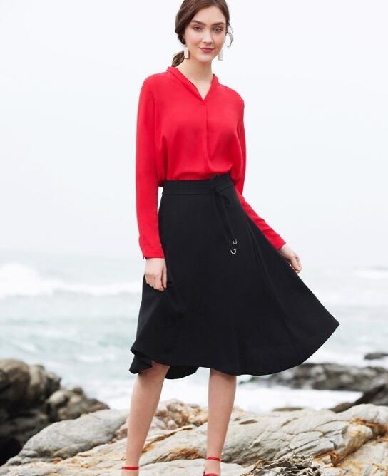 暖色的红色彰显满满的活力与俏皮感。立领领口的设计,很好的将颈部曲线与锁骨勾勒出,凸显满满的优雅与气质感。雪纺材质的存在,更为舒适透气,对于夏季而言可是极佳之选。简洁宽松的版型更为休闲活力。下身搭配着黑色半身裙,整体更为优雅大方。高腰的款式很好的将身材比例拉长,凸显高挑范。宽大的裙摆设计,更为甜美,