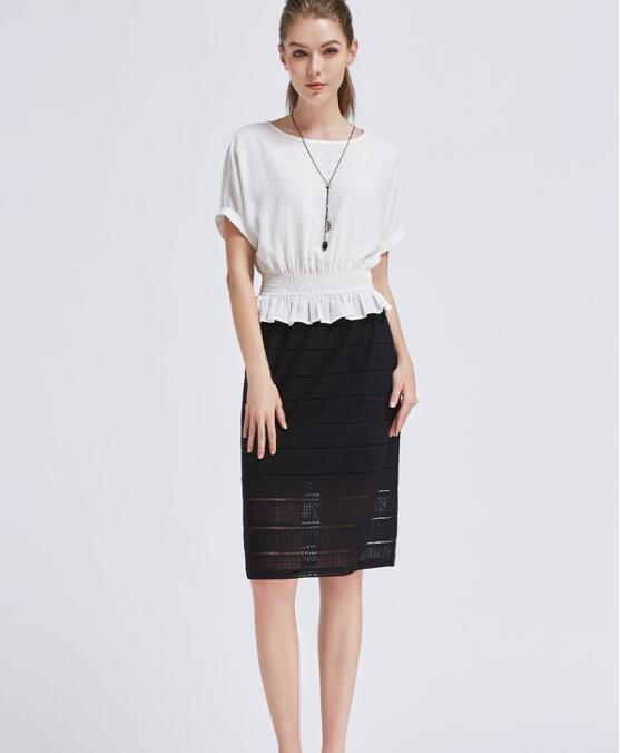 LOOK1:上身选择一件白色的短袖,简约的版型,束腰的设计凸显腰线,穿起来简约显气质。下身搭配一条黑色的半身裙,穿起来展现出女性柔美的一面。再搭配一双银色的尖头高跟鞋,打造出了简约的知性造型!