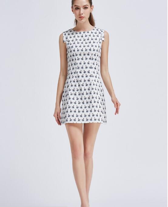 个性印花今年特别流行哦,小天鹅的印花图案富有趣味和时尚感,同样是无袖的版型,袖口位置微微的折皱处理看着更多了几分时尚的味道。自然收腰,版型简约,上身活泼洋气,喜欢的可以尝试一下哦。