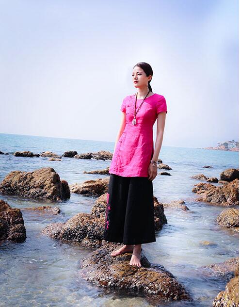 在海边可以感受海天一色的效果,配上红色的上衣,肯定让你的眼前一亮,宽松黑色九分长裤,侧边的修饰,红色和黑色的结合,清新又具活力,年轻感尽显活力。