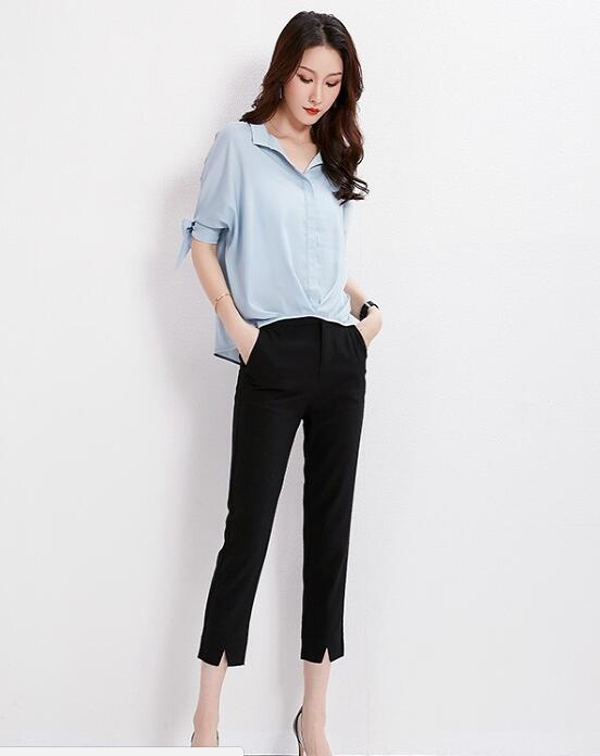 衬衫+长裤则是日常的经典代表。不同于中规中规的白衬衫,简洁清爽的蓝色让人倍感清爽大方。宁静的蓝色也正好与盛夏季相对应,而小V领的领口设计,更是巧妙的将颈部曲线与锁骨勾勒出,小心机的设计就足以助你更吸晴了。加上衣袖处蝴蝶结的点缀,也给整体增添了几分童趣俏皮感,甜美小清新感十足。搭配着黑色九分裤,整体既简洁大方,又不失时尚魅力!