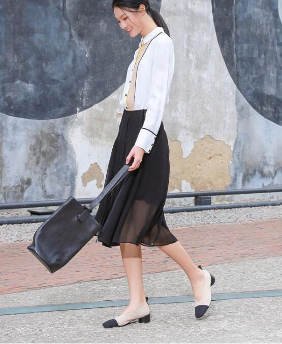 通勤造型中经常能看到衬衫的影子,衬衫是一款百搭显气质的单品,女生打造通勤造型就可以为自己选择一款有质感的衬衫。女生上身可以选择一件白色的衬衫,颜色清爽干净,穿起来显气质,简约大方。下身搭配一条黑色的半身纱裙,颜色经典百搭,穿起来柔美低调。再搭配一双简约风的气质单鞋,打造出了气质感的简约通勤造型!