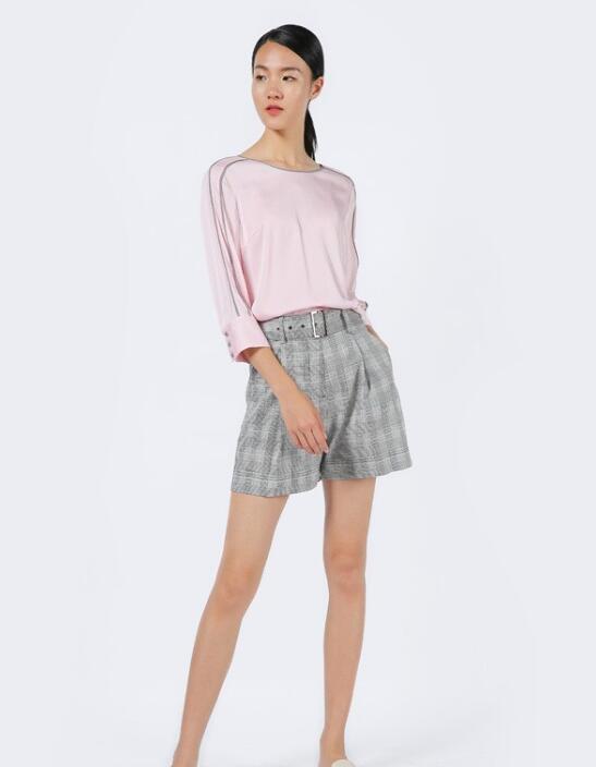 夏天是多彩的,为了符合夏日的氛围,女生可以在造型中融入一些亮色系的单品。上身可以选择一件粉色的衬衣,颜色清新甜美,穿起来简约大方显气质。下身 搭配一条灰色的格纹短裤,颜色低调耐看,格纹元素经典时尚,穿起来拉长女生身型,显得更为高挑。再搭配一双浅色系的单鞋,打造出了显高的简约通勤造型