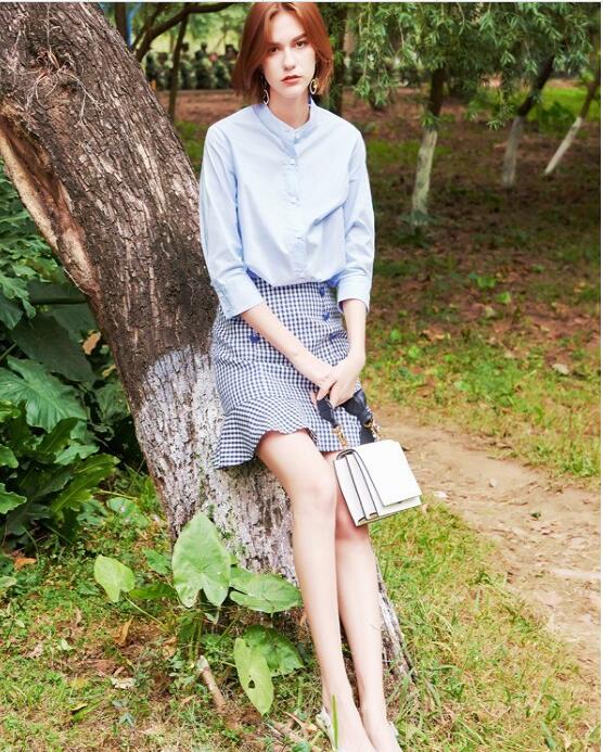 简单的衬衣打扮,永远不过时,简约干净的立领,衬托精神气质。落肩五分袖的设计,造型独特,隐约透露出一丝小性感。搭配荷叶边的半身裙不会显得过于呆板,简约却不失大气。