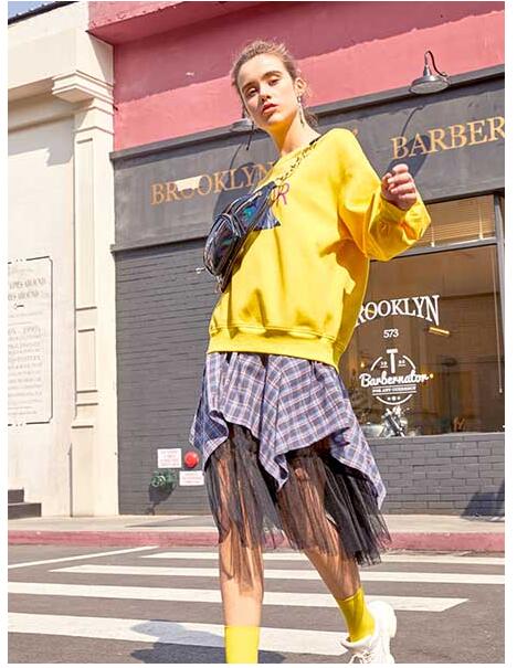 时尚潮流装扮,成为一个街头艺术达人吧!超宽松海绵宝宝颜色的上衣,上衣上的图案增加了一丝可爱。下身则是穿的一件裙子,裙子下还有透明纱布的来防晒,再大的太阳也不怕啦!
