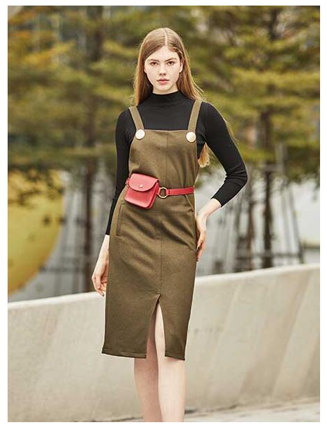 背带连衣裙,内搭纯黑色长衣,外面则是棕色的连衣裙,非常时尚的穿搭,你确定不了解一下吗?下身的开衩的设计,无疑是增加来时尚感,整体就是时尚达人!