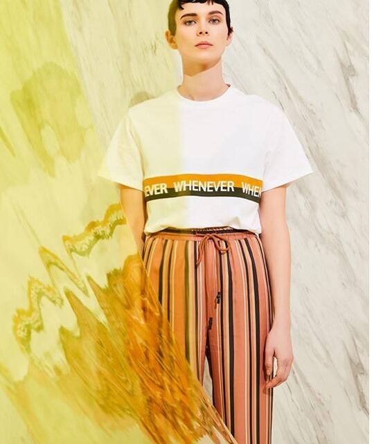 LOOK2:夏天造型要清清爽爽的,女生可以搭配一件白色短袖,颜色清爽干净,增添了英文图案穿起来更具时尚感。下身搭配一款条纹休闲裤,条纹元素经典时尚,穿起来休闲不失时尚感!