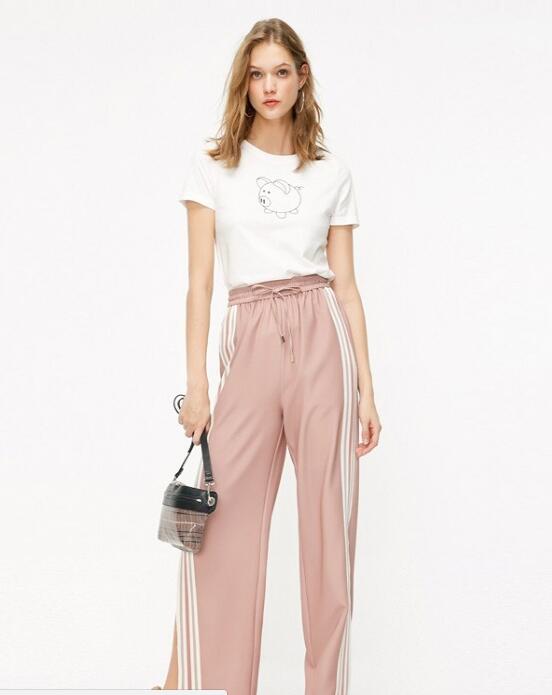 LOOK2:短袖是夏日衣橱必备单品之一,女生可以为自己选择一件白色短袖,颜色清爽干净,修身设计穿起来凸显身材,增添了卡通图案穿起来避免单调。下身搭配一条粉色休闲裤,颜色甜美清新,侧边条纹设计穿起来更具动感。再搭配一双卡其色的休闲鞋,提升造型的时髦感!