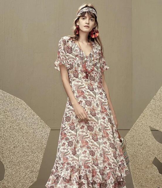 这款碎花长款连衣裙,V领的设计,简约大方,更好的展现锁骨的性感,穿在身上尽显古典优雅气质。袖子上的花边即使优雅也可以很甜美。收腰的设计,更好的拉高身材比列,打造优美大长腿,A字版型的裙摆,更好的遮掩腿部的肉肉,裙摆处的花边,看起来带有少女的甜美的同时还有一种随性优雅迷人的感觉,搭配一双凉鞋,正是美的没边了。