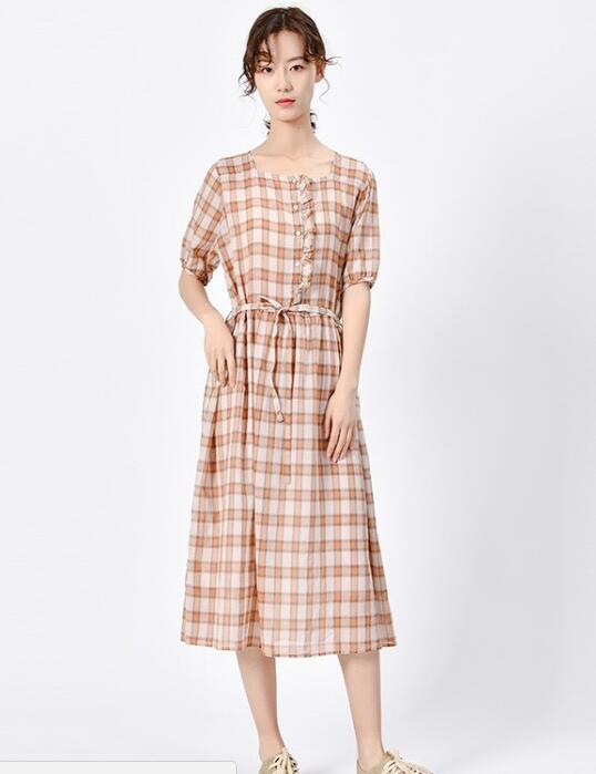 格纹连衣裙在夏日也是很受欢迎的,先不说格纹是时下最流行的元素,而且连衣裙在夏日可是必备单品。圆领的设计,更好的修饰脸型,凸显锁骨的性感,半袖的设计,刚好遮住胳膊上的拜拜肉,腰间系带的的设计,更好的束出曼妙身姿,宽松的裙摆,在夏日清凉透气,而且这种款式偏浅色系,带来一丝文艺风,搭配一双休闲帆布鞋,整体的造型可圈可点,也很休闲时髦,很显气质。