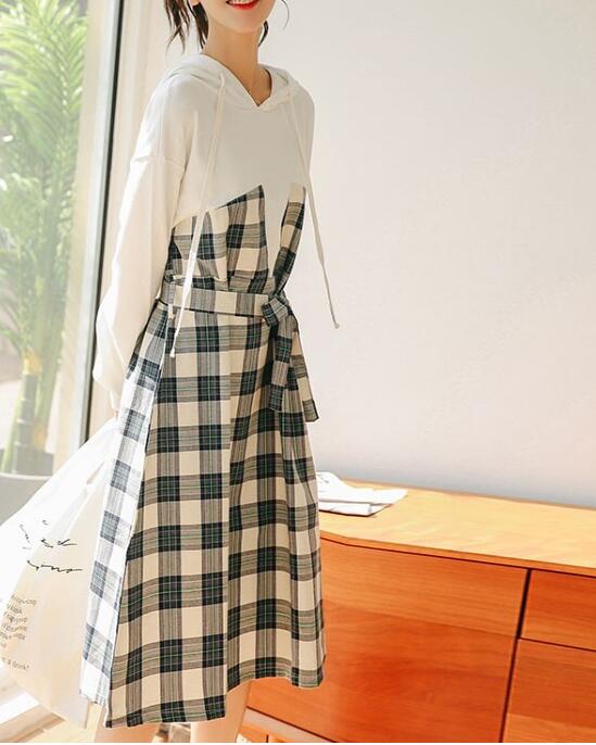 平时喜欢穿搭休闲自然一些的女生,就可以尝试选择一条连帽拼接式长袖连衣裙,配色清爽耐看,白色与格纹拼接设计让造型更具时尚感,格纹元素时尚经典,穿起来减龄时尚,连帽设计让造型更具休闲感!女生可以为自己搭配一双小白鞋,呈现出了时尚减龄的造型!