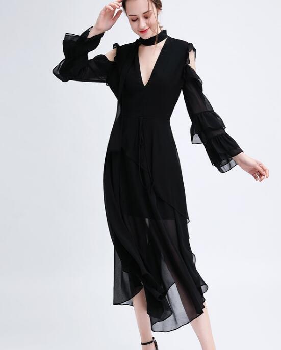 女生可以为自己选择一款经典色系的长袖连衣裙,己闲女装品牌的这款黑色长袖连衣裙就不错,颜色经典百搭,挂脖深V设计性感有女人味!露肩设计穿搭起来更具看点,穿起来优雅显气质,飘逸柔美!再搭配一双黑色的简约风高跟凉鞋,打造出了优雅的气质造型!