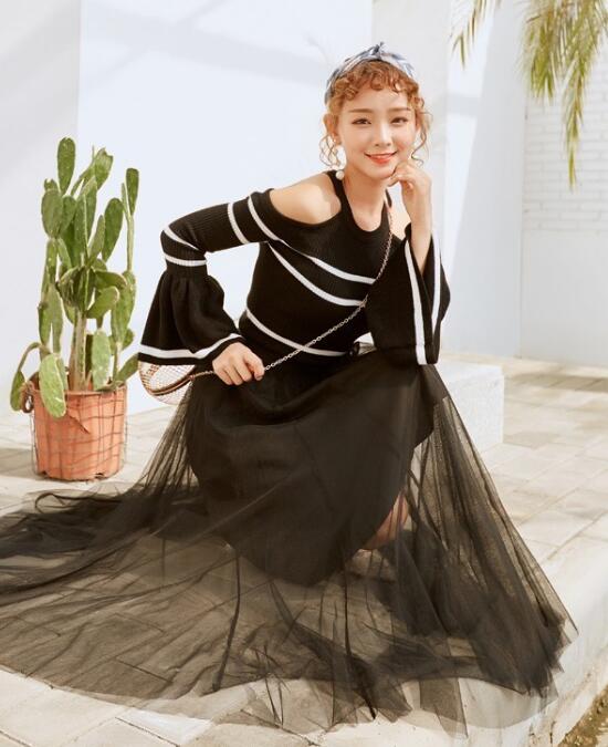 网纱裙的搭配不知道你了解多少,图中这款穿搭,黑色条纹的上衣,露肩的设计,性感时髦。圆领的设计,简约大方,下半身搭配一件网纱半身群,看起来很仙,而且这款穿搭很显瘦,搭配一双高跟鞋,整体的气质,简约大方,而且远远看去别有一番风味,这样的穿搭很显瘦而且半身裙的搭配看起来真的很仙。