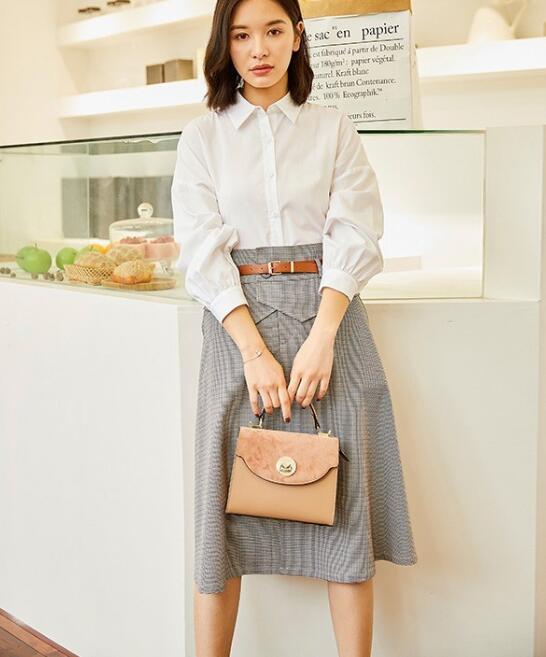 永不过时的白色衬衫搭配格子高腰伞裙,秋季非常chic的搭配,这选择这一套穿上真的是太时尚了。灯笼袖的设计,起到遮肉显瘦效果。搭配高腰的格子伞裙,非常具有女人味,腰间利用腰封装饰,整体看起来非常时髦。