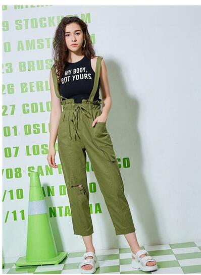 为了让造型更为清爽一些,可以选用休闲背心来打造时尚感的造型。阿莱贝琳女装品牌这款黑色休闲背心,颜色经典百搭,穿起来休闲时尚,增添了英文图案让造型更具看点!外面搭配一条绿色背带裤,颜色出挑正流行,穿起来时尚有个性。再选择一双白色的休闲凉鞋,呈现出了时尚有个性的造型!