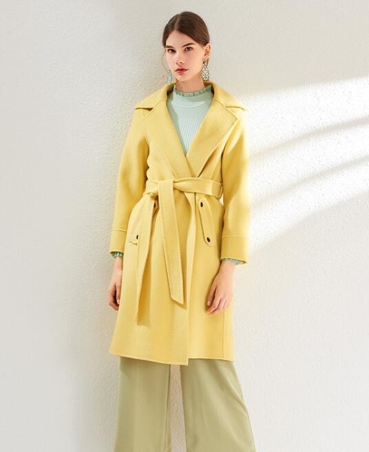 谁说在秋季就不能选择亮色系的衣服呢,这款黄色大衣,看起来在上班的时候穿也很合适,腰间腰带的搭配将腰身束出来,不会显得臃肿而且难看。搭配一件蓝色的条纹上衣,黄色与蓝色的碰撞更显清新自然,下身搭配一件绿色阔腿裤,不仅清新还很时髦,宽松的裤子将腿型遮盖住,搭配一双高跟鞋,整体的造型简约有很优雅。