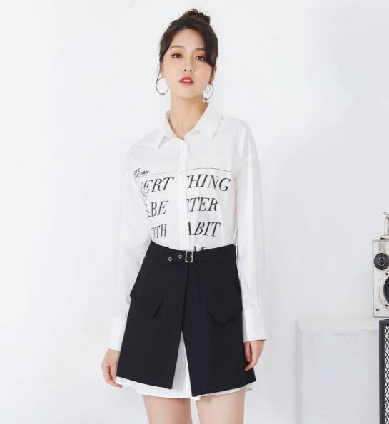 这款衬衫假两件连衣裙,真的很好看,衬衫本身就是很显气质的时尚单品,搭配上黑色半身裙的设计,简约大方,黑色与白色的搭配时髦又百搭翻领的设计显气质还很大方,腰间黑色半身裙的搭配,很有个性,字母的设计,时髦有很简约,裙摆的长度刚刚好,露出性感的大长腿,这款穿搭很适合上班族的搭配,这款连衣裙是不是很好看?