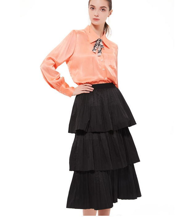 纯色衬衫,黑色藕裙。充满时尚感和现代感的纯色衬衫,超时尚的设计,最纯碎的享受。黑色的藕裙层次感跃然而出,看上去好像穿了三条裙子一样,令人感到很特别。走在热闹繁华的街上,回头率高达百分之九十九。