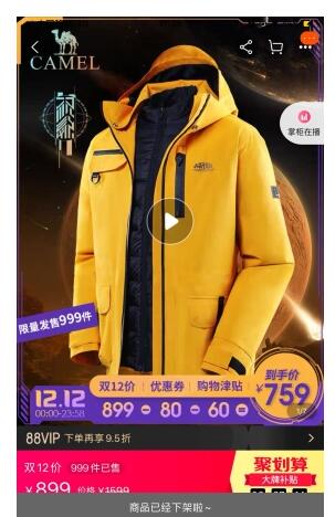 日前,骆驼官微表示,将在12月12日天猫平台推出骆驼户外新一代“祝融”系列科技冲锋衣,该系列冲锋衣最大的卖点是携带了最新研发的智能加热黑科技,能够完美解决冬天湿冷保温效果欠佳的难题以及帮助用户探索更寒冷的户外环境,双十二限量发售999件,售价899元。12月12日上午,骆驼户外官方旗舰店首页挂出公告,称“祝融”系列科技冲锋衣已被火速抢购一空。