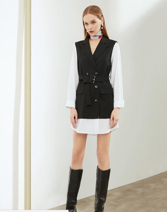 这款马甲的搭配很是干练大方哦,V领的设计露出性感的锁骨曲线,黑色的颜色很是显瘦,翻领的设计彰显出自己时髦的气质,腰间搭配一条黑色腰带秦松将自己的小蛮腰束出来,将自己的优雅干练穿出来,白色上衣搭配在一起,很是好看哦,裙摆的长度露出性感的腿部曲线,搭配一双高帮靴子,整体的造型帅气干练。