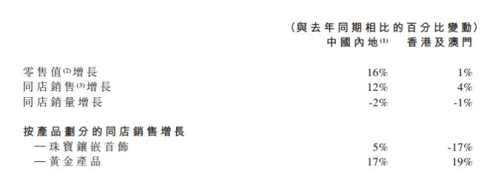 而周大福的商品在同店出售添加中,黄金商品得到大幅度添加,内地商场与香港、澳门商场别离添加了17%、19%。