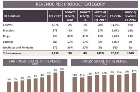 潘多拉核心的Charms系列出售额增加1%至4.35亿美元;手镯品类出售额跌落7%至1.28亿美元;戒指出售额则录得41%的显著增幅至1.1亿美元;耳环和项圈的出售额均大涨57%,别离录得4174万美元和3983万美元。