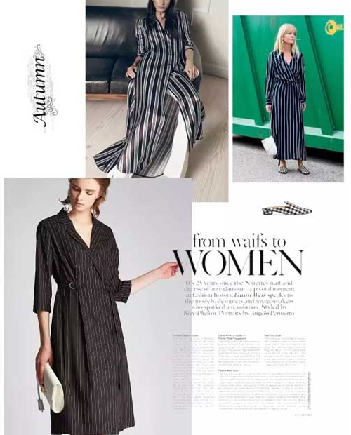 不同于宽条纹的气场,精致细腻的细条纹裙装有着温婉的小女人气质。七分袖设计加上独特的系带收腰方式,正适合这个略带凉意的季节。修身的款式,勾勒出优雅身姿,不论是去出勤还是去约会,都能美成秋日的一道风景线。