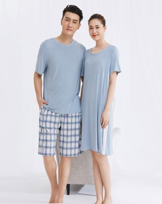 这一套是情侣装哦。女款是上面介绍的那一款,而男款就比较有特征啦。上身是和女款一样的蓝色条纹衫,纯棉用料不会有任何紧绷感,让你感受到睡衣的舒适。下身是一款五分裤,格子系于条纹系相调配演绎出流行元素的潮流感。