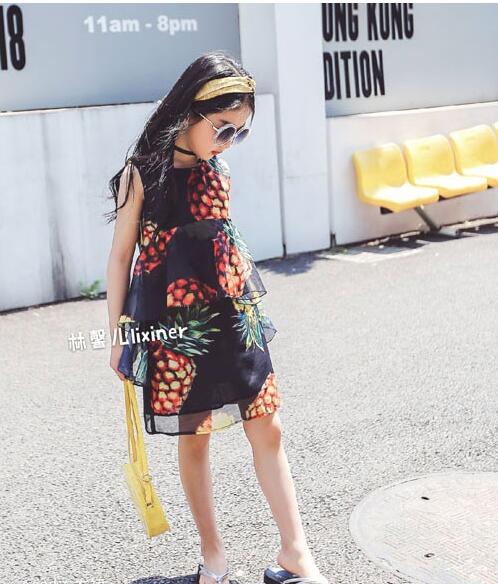 菠萝图案拼接的连衣裙,酸酸甜甜的爽心,前后摆不规则的设计,透明的丝状裙摆,时尚气息浓郁,春夏时节出街,成为街头时尚风景。