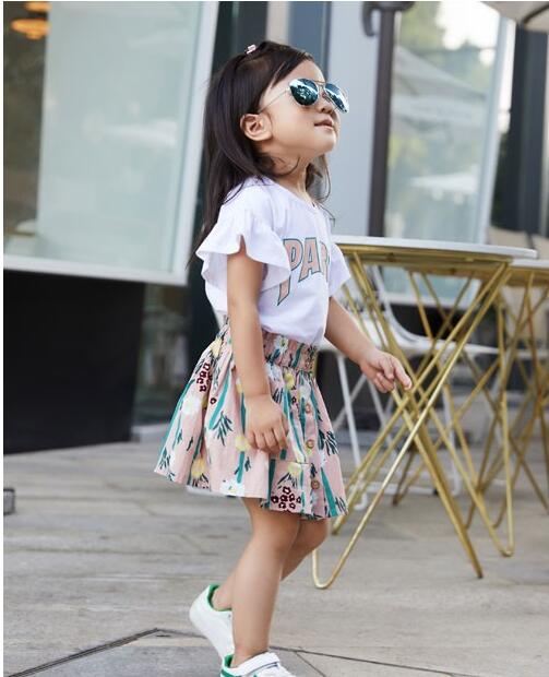 精约大方舒适的棉质白色印花T恤,木耳边的袖口衬出天真童趣,淡粉色印花阔摆裙时髦优雅,小淑女气质中又有精约潮流范。