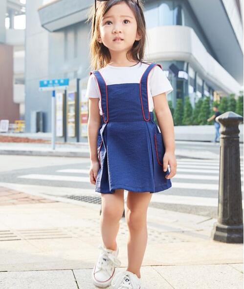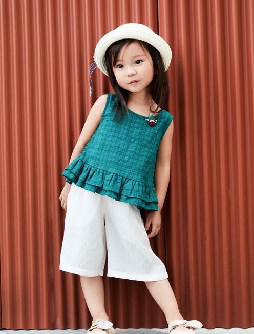 一件精美的靛蓝色格纹吊带小衫,简练时髦,皱褶的阔版裙摆 ,添加童趣,调配一条精约的白色阔版裤裙,白色的弁冕对应着裤裙,衬出小萝莉舒适,文雅,时髦气质。