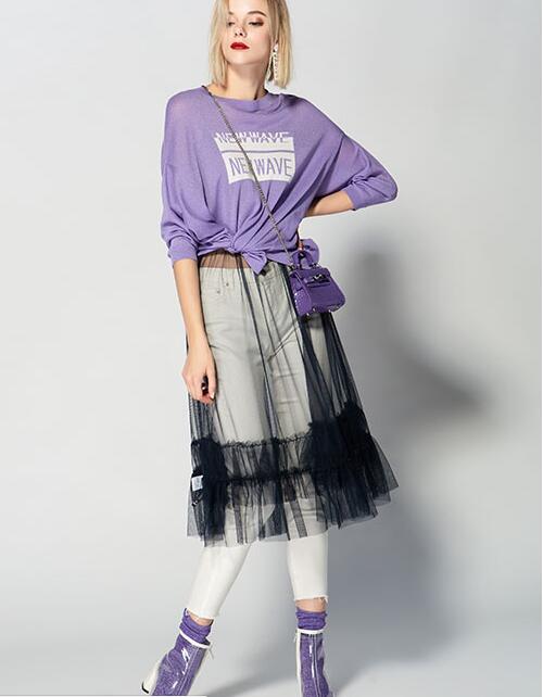EXUN衣迅2019春夏日新款时髦女装,丁香紫长袖T恤粘纤面料,具有柔软、润滑、透气等特性,具有相当好的调湿作用。显瘦象牙黑色蕾丝,性感娇柔。