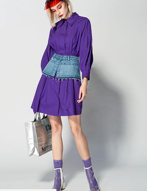 EXUN衣迅2019春夏日新款时髦女装,长袖高雅潮流淑女紫色时髦连身裙,欧美风味,知性女士的时髦选择,个性的牛仔点缀,带着对世俗的不羁。