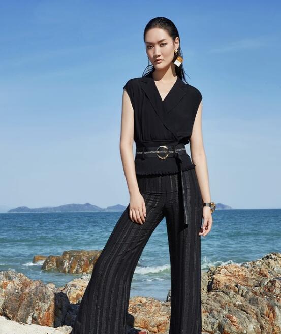 黑色一直是衣橱里非常经典耐看的色彩,这种颜色低调不失干练,也是职场上运用最多的色彩之一。佳纷女装上图这件黑色的无袖款上衣,采用优质的西装翻领以及西装面料,配合修身的剪裁设计短款的版型,腰间的系带设计,穿着起来非常的显高显瘦。搭配上一一条黑色条纹的高腰款阔腿长裤,一双深棕色的尖头高跟鞋,轻松秀出满屏大长腿,特别的优雅耐看。