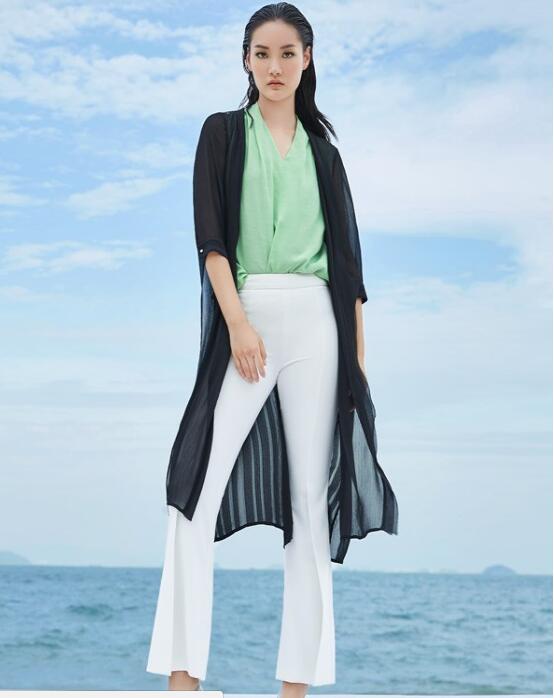 非常清新耐看的这件浅绿色的无袖上衣,采用优质的真丝面料,融入法式简约风的V领设计,穿着起来非常的大气耐看,搭配上一条纯白色的高腰微喇叭裤,外穿一件黑色的长款雪纺开衫,脚踩一双银白色的尖头高跟鞋,非常的干练,又不失优雅气场。