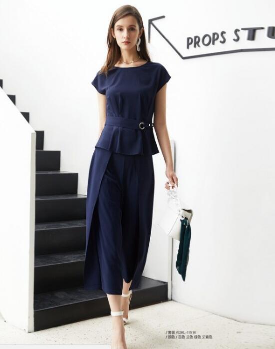 这一款藏蓝色的设计,既显身材又显成熟。这一款上身是一件短T设计,采用了蓝色的设计,成熟又有魅力的颜色。领口处采用了宽领口设计,比较时尚。腰间采用了皮带设计,时尚又具有魅力。下面是一件比较包臀设计,采用了开叉设计比较时尚又性感。