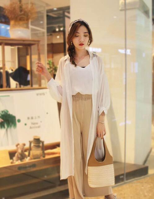 非常清纯的打扮,白色的上衣搭配长裤,在加上一件单薄防晒的外套。像是初恋一般的感觉,这类风格都很容易给人留下甜甜的感觉。