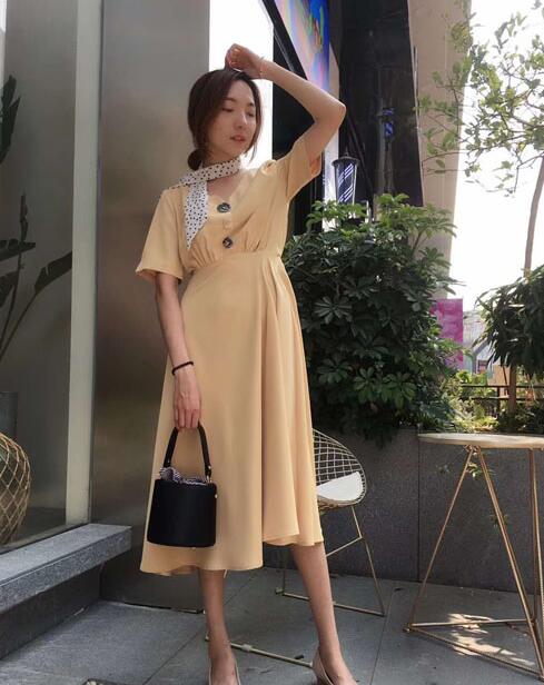 暖色系鹅黄色更好的将甜美与小清新感彰显出。V领的领口设计巧妙的价格颈部曲线与锁骨勾勒出,极为气质优雅。花边衣袖的设计更巧妙的遮挡小粗胳膊,为设计师鼓掌哦!