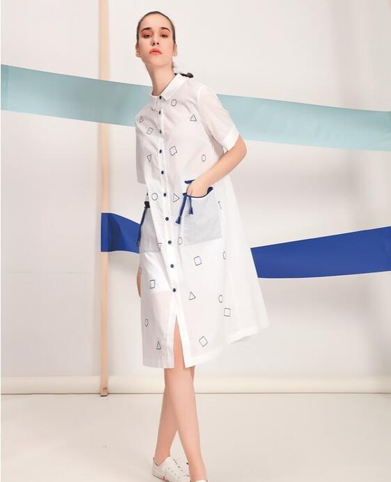 这款衬衫裙将蓝色与白色很好的融合,裙身的几何元素简单又时尚,口袋的设计也很特别。蓝色很清爽,裙子的版型比较宽松,袖子的长度恰到好处,整体属于简约时尚的风格。裙子长度刚好遮住比较粗的大腿,非常显瘦,搭配一双简单的白色帆布鞋就可以。上班约会都特别适合的一款裙子。