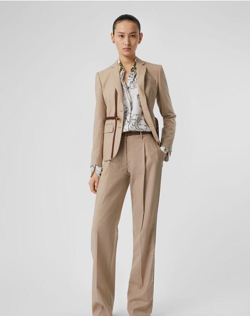博柏利Burberry品牌 女士皮革条纹羊毛量裁西装,这款新款上市的女士西装,也让我们看看有何魅力吧。颜色是驼麻灰色,颜色的色度也是刚刚好,也是非常的修饰身材。