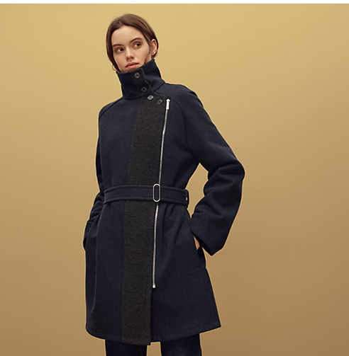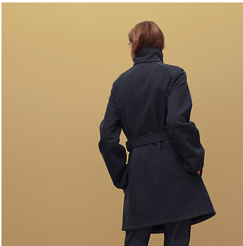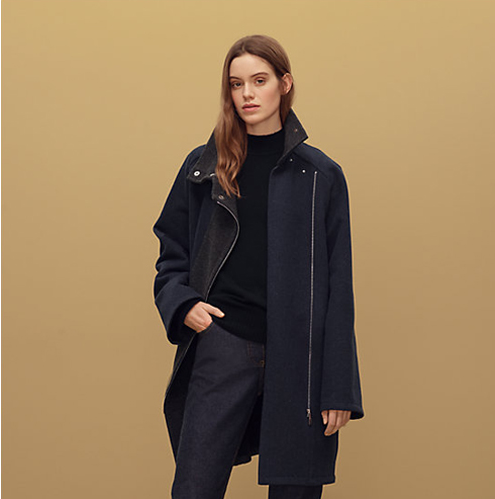 奢侈品牌爱马仕新款上市的牛仔派克大衣,法兰绒内衬牛仔派克大衣70%棉,30%羊毛,前襟镀钯拉链,领口饰有“马鞍钉”雕纹按扣,腰带饰有镀钯腰带扣。
