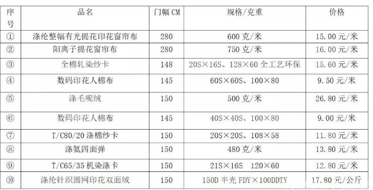 中国轻纺城畅销面料排行榜(2019年9月9日)