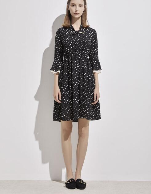 初秋的天气,气温微凉,我们还是可以穿美美哒的裙子的,看你即永恒的这件长袖连衣裙,黑白配是最经典的色系搭配,,袖子采用了荷叶边的设计,满满的少女感,配上黑白波点装饰衣身,看起来青春气息满满的。