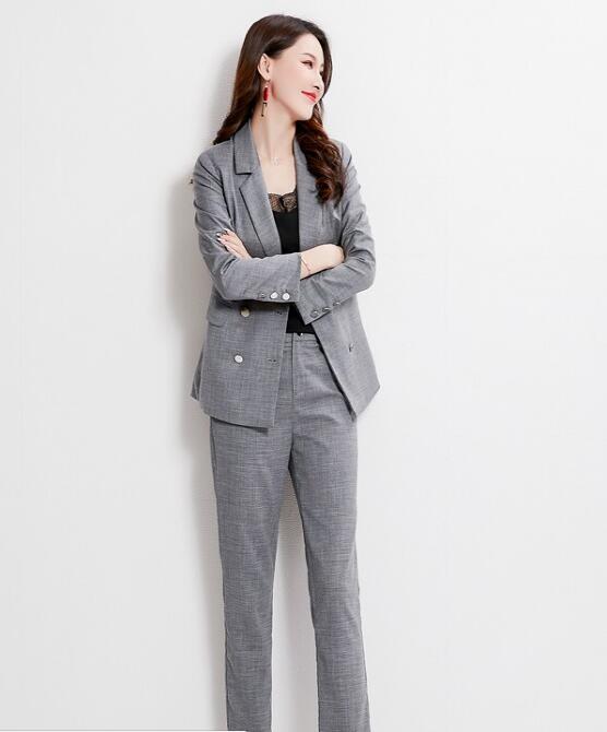西装套装是职场女性的心头爱,简单好穿又能很好的省去了搭配的烦恼。这款西装套装颜色上采用的是比较经典的灰色,简单大气的款式更显高级。西装上衣经典的翻领设计优雅知性,口袋以及纽扣的设计多了几分时尚感。利落精细的剪裁以及完美的垂顺度更显西装的高级质感。搭配一款西装裤即可。不管是上班还是逛街都会非常合适的一套穿搭哦!