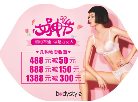 女神节满减活动,仅限直营店肆,活动时刻截止到3.8号。女神节,相约布迪,做魅力女性,快来选购一套取悦自个的内衣吧!
