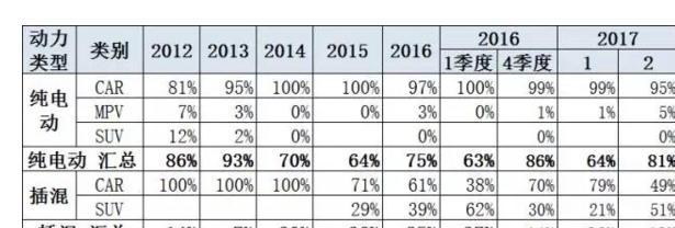 17年2月纯电动乘用车中基本是汽车商品,前期的MPV\SUV逐渐萎缩,这也是电池影响的新能源车商品升级放缓。
