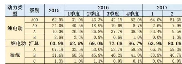 15年的纯电动车中的A00级车占比达63%,且A0级成为纯电动乘用车的肯定主力,这两类组合的经济型电动车成为主力。但16年2-4季度以来的A级电动车迸发增加到纯电动比例的37%摆布。17年的A级电动车在上半年仍有北京商场的无穷释放潜力,2月的占比稍低,还有较大增加潜力。