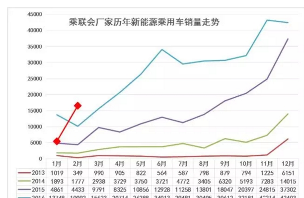在15年新能源车高增加后,16年新能源乘用车商场出现调整标准发展的特征。16年上半年的3-6月新能源车逐渐实现康复性增加,6月冲刺到3.5万台水平。下半年的7-10月新能源车处于3万台摆布的位安稳状况调整整固。16年11-12月的新能源车到达4.2万台高位。17年1月0.54万台体现了商场对方针补助的极度依靠,跟着第一批目录的发布,2月新能源车商场产销大幅高于1月的3倍也是较合理的。