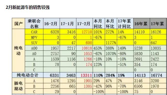 依据乘联会厂家数据,17年2月新能源乘用车销量到达1.65万,环比1月增加202%,同比增速64%。2月新能源乘用车的环比1月增两倍出现补助目录资本到位后的厂家产销重新启动的特征,尤其是经济型电动车的潜力无穷。但1-2月新能源车累计销量仍是负增加,3月后的新能源商场是可等待的高增加。